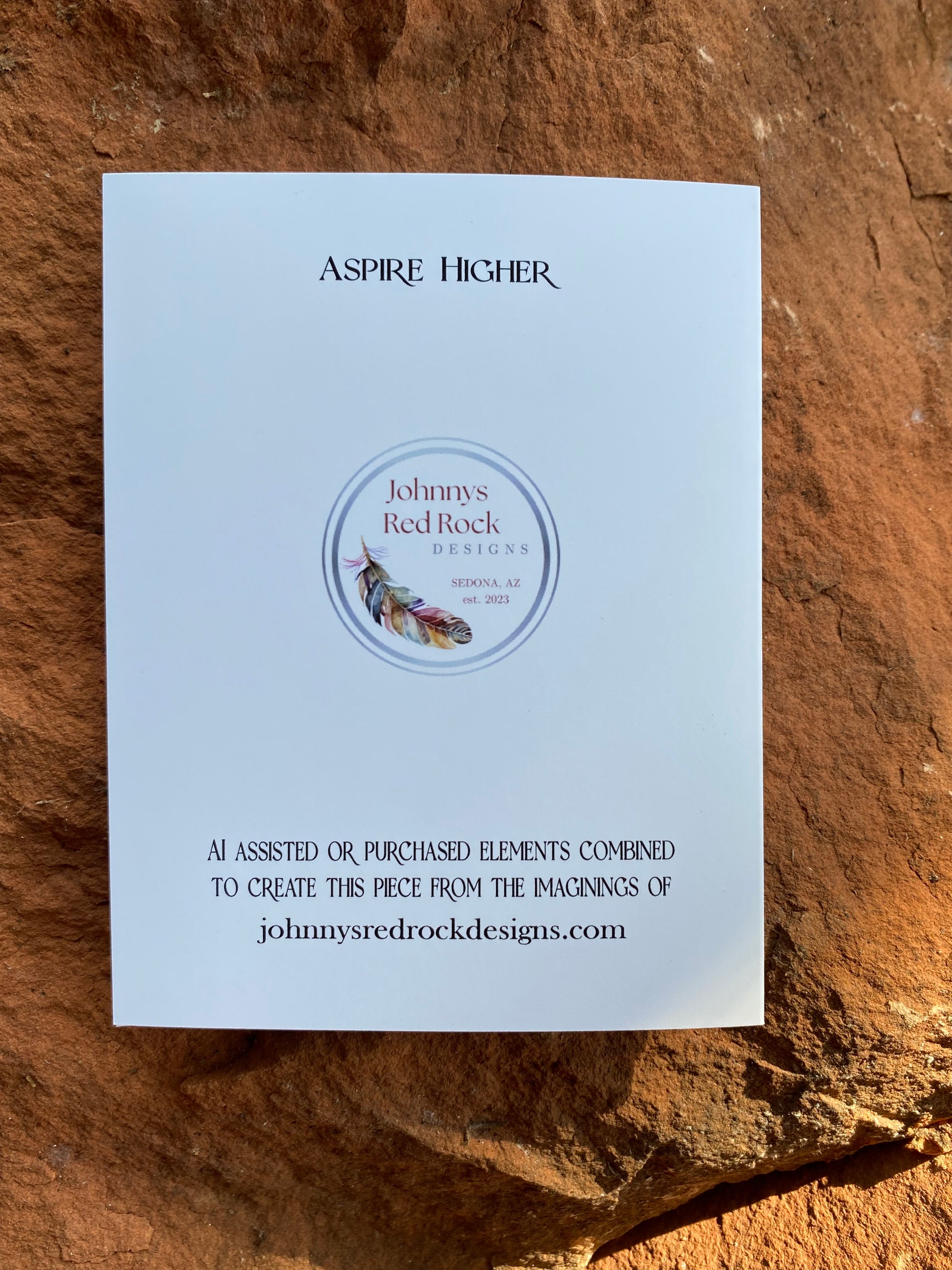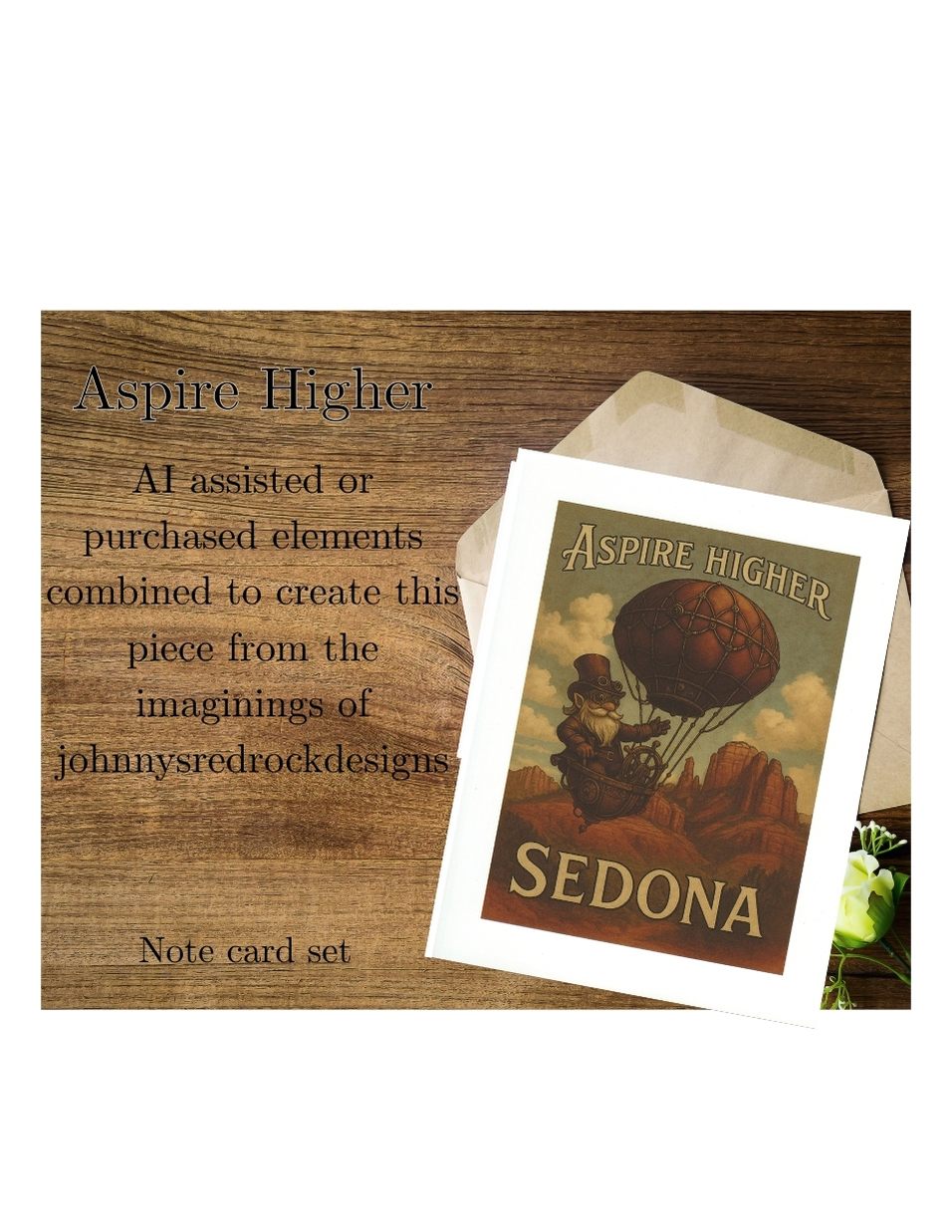 Let your imagination take flight over Sedona with the Aspire Higher note card! It's a whimsical note card set featuring a daring steampunk gnome piloting his airship above the iconic red rocks of Sedona. This playful yet inspiring design is a reminder to never settle, to rise above the ordinary, and to always aspire higher in all things!