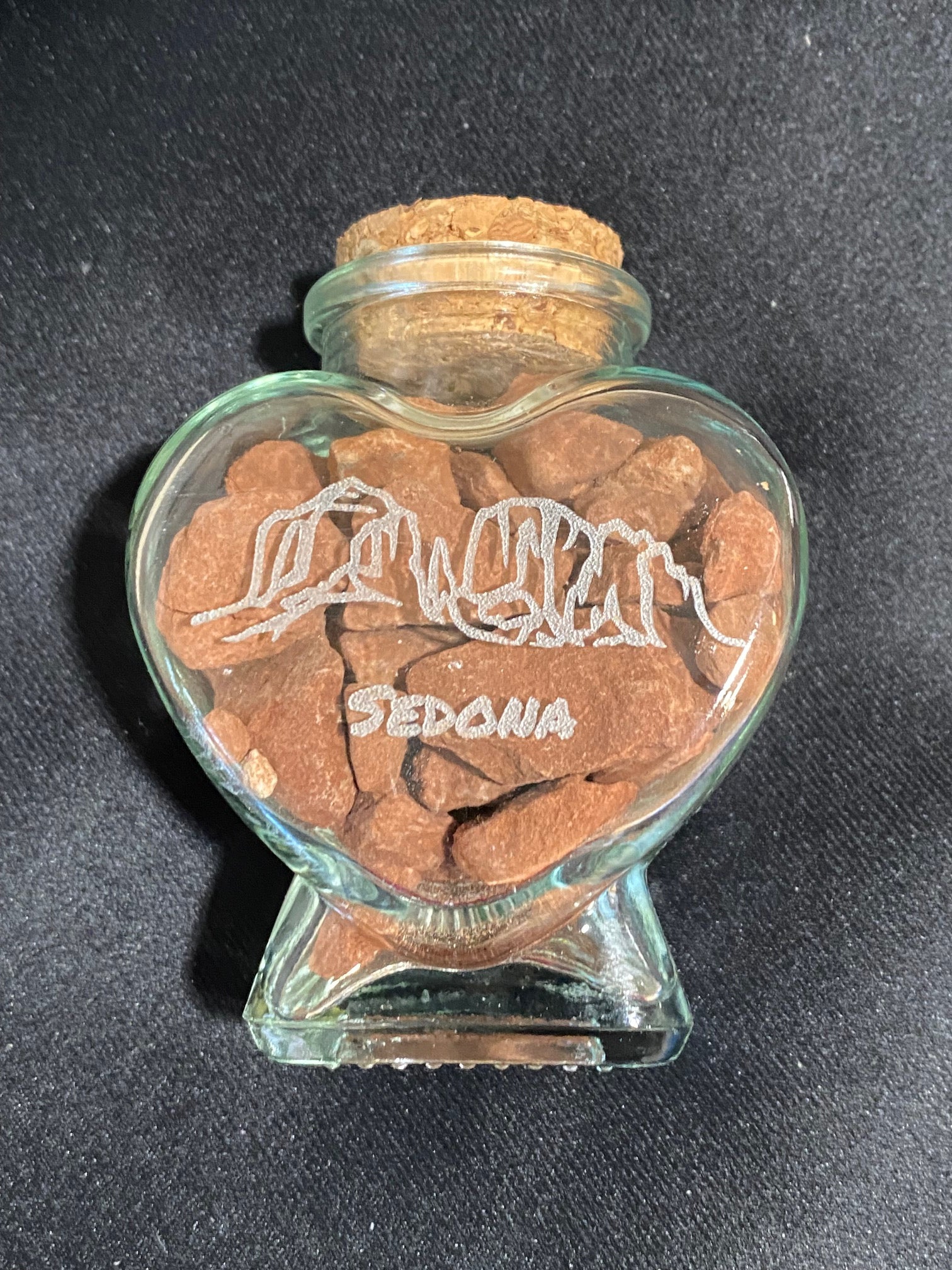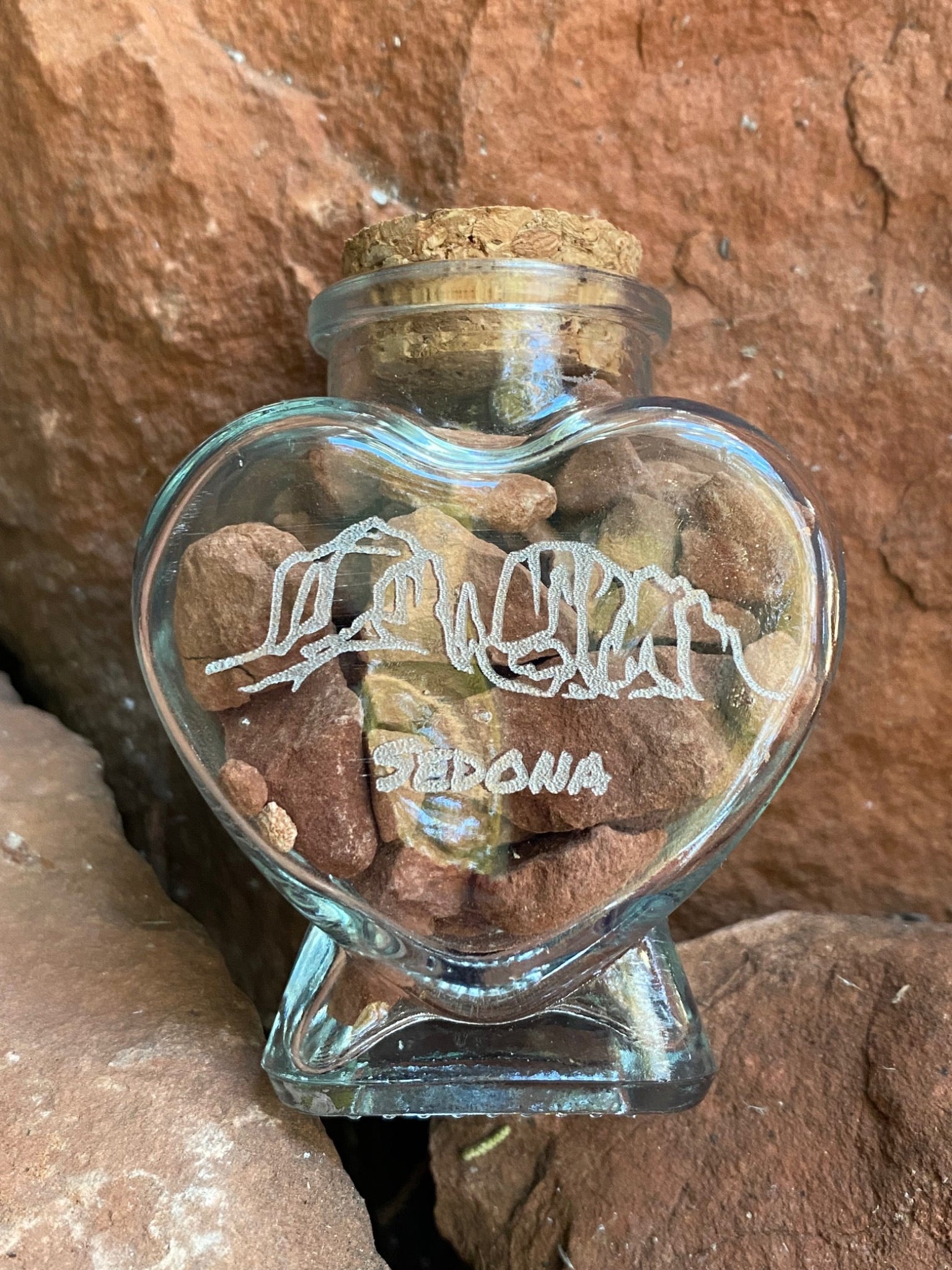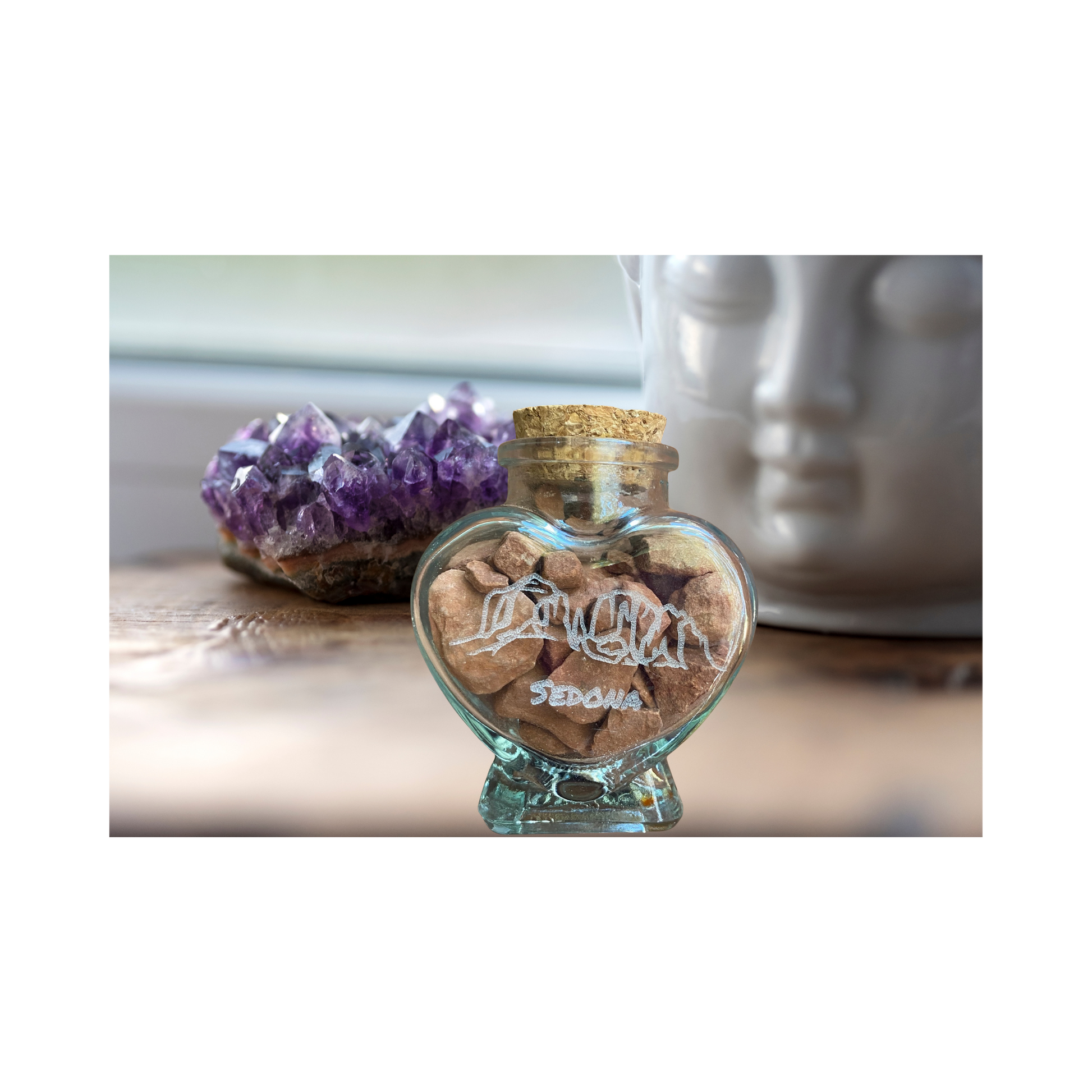Heart of Sedona features a beautiful glass heart jar with the iconic Cathedral Rock engraved and embellished in silver leaf across the front. Each jar is filled with genuine Sedona Red Rocks- each stone infused with Sedona's grounding and radiant enerty.