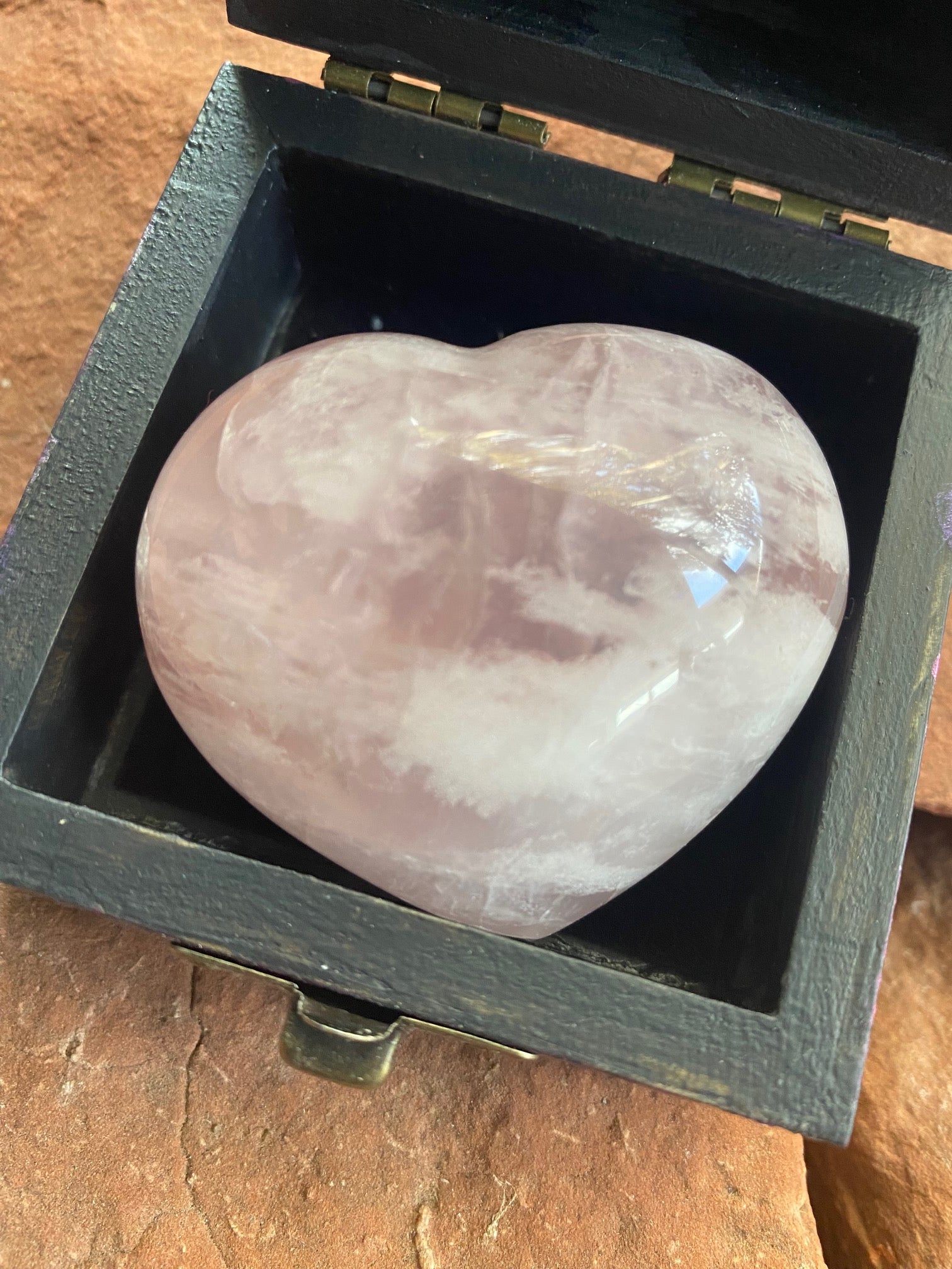 Each rose quartz heart is natural and unique. Variations in color, translucency, shape are part of it's natural beauty. Each box is hand painted and will be unique.