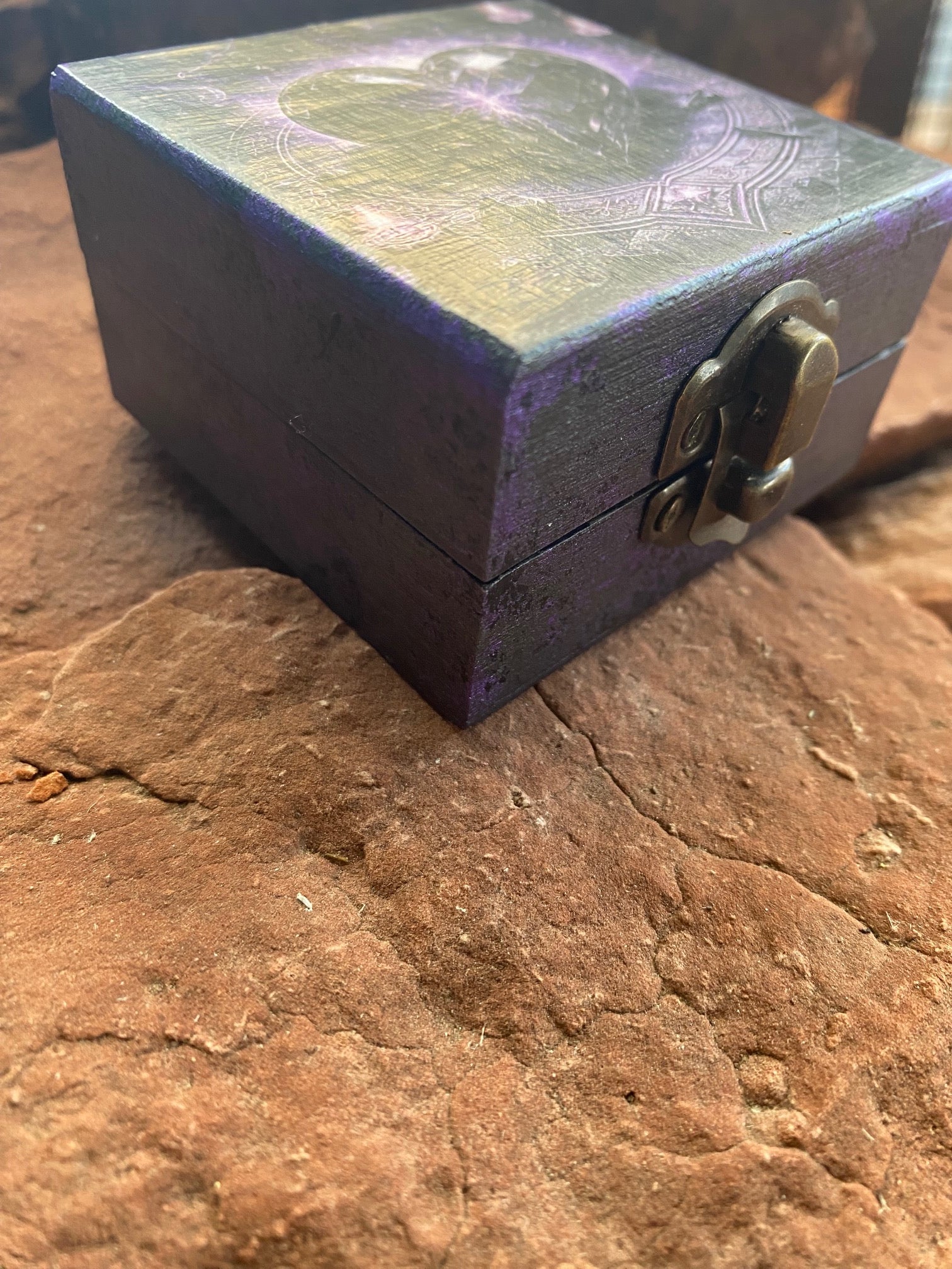 Each box is hand painted, layered with luminous pinks and purples that drift across a deep black base, creating a rich, celestial contrast. No two boxes are exactly alike, making each piece a one-of-a-kind expression of care and intention. The interior is thoughtfully finished to protect treasured items, from crystals and jewelry to notes, mementos, or ritual tools.